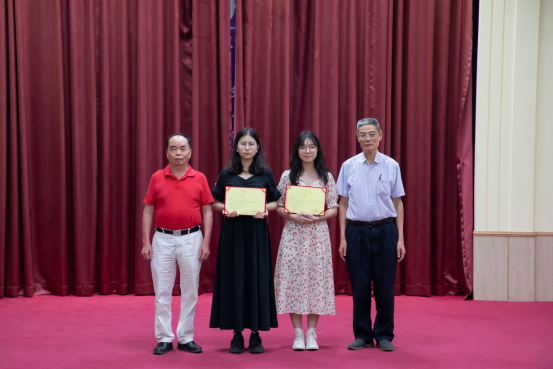 蓝永金副校长副书记(左一)、廖振亮副校长(右一)为“青春·悦读”读书分享交流大赛颁发一等奖荣誉证书