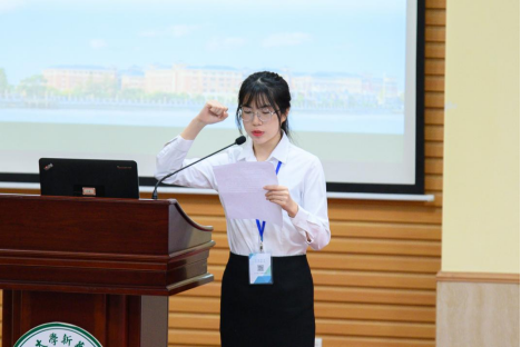 的学生郑少丹代表参赛选手宣誓:参赛队伍将持严谨认真的态度,遵守比赛规则、赛场纪律,尊重裁判和选手。