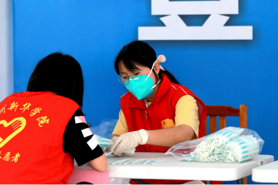 志愿者在核酸检测等待区引导师生登记核酸检测个人信息