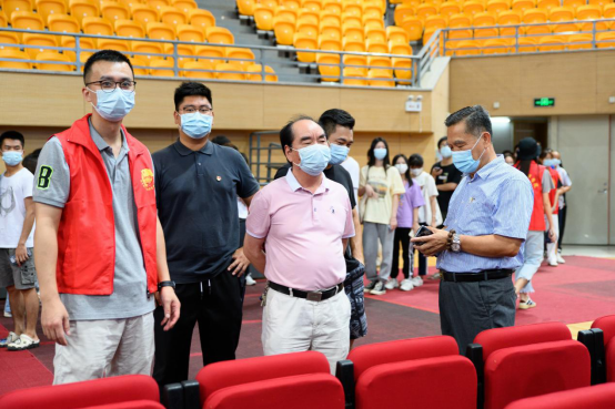 蓝永金副校长、副书记(左三),广东东宝集团副董事长刘荣宏(右一)现场指导东莞校区核酸检测现场布置