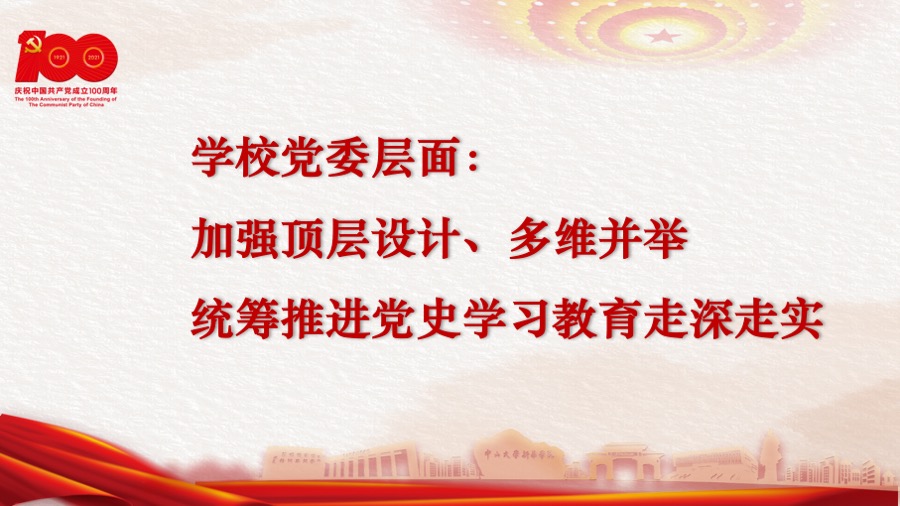 党委认真学习贯彻总书记重要讲话精神,严格落实党中央、省委部署和省教育工委要求,第一时间传达学习、动员部署,紧扣“学史明理、学史增信、学史崇德、学史力行”工作目标,扎实推进全校党史学习教育走深走实,取得了阶段性成效。为进一步深化工作成效,在省委教育工委党史学习教育第八巡回指导组的精准指导下,做好阶段性总结,明确下一阶段工作目标,多措并举、深入推进党史学习教育融入“三全育人”大格局、嵌入立德树人根本任务之中,以全党集中开展党史学习教育为重要契机和持续动力,全面推进校内各单位、各级组织、全体师生党员群众学党史、悟思想、办实事、开新局,我们今天在此隆重召开全校党史学习教育推进会,再部署、再动员、再推进,力争在前一阶段工作成效上开新局、谱新篇、上新阶。