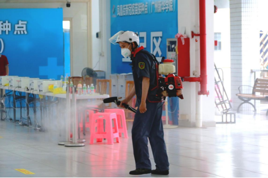 当日工作结束后,工作人员对新冠疫苗接种点进行消杀