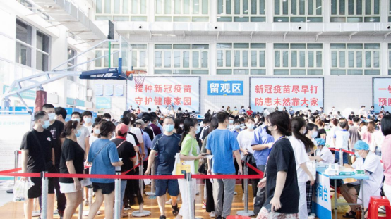 的同学具备当代青年大学生的文明素养,遵守现场工作人员的指挥与安排,按照规定、安排的时间有条不紊地排队进行接种。