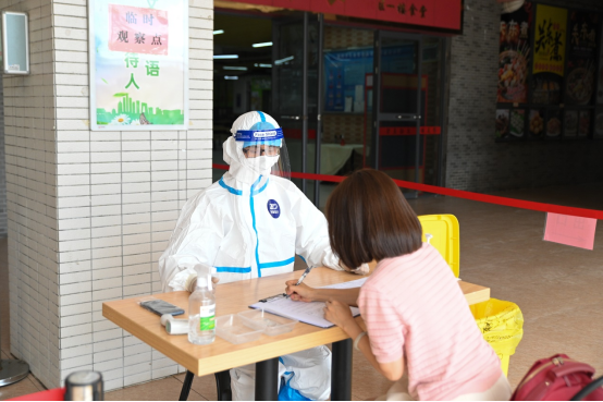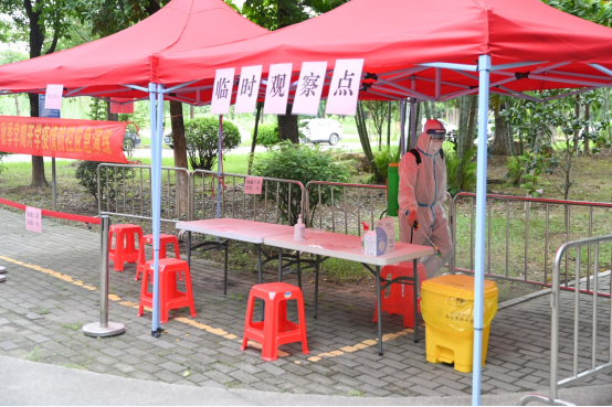体温异常的“学生”在临时观察点进行消毒、更换口罩、再次测量体温、进行健康监测登记等