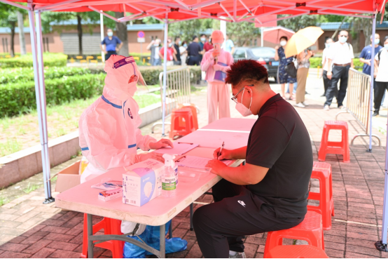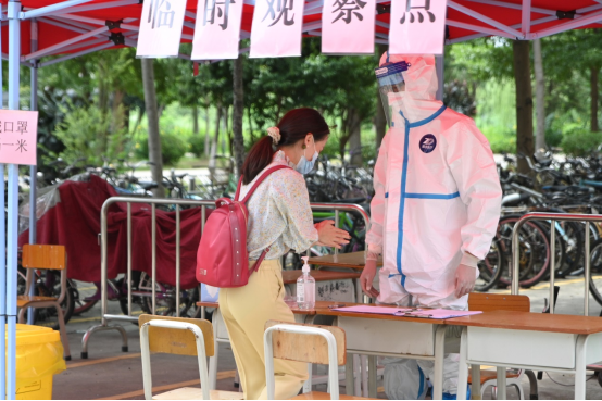 体温异常的“发热学生”在临时观察点进行消毒、更换口罩、再次测量体温、进行健康监测登记