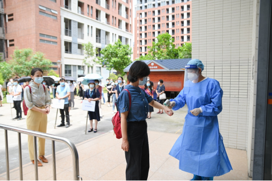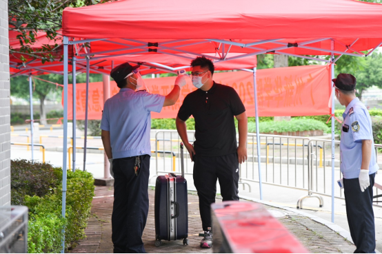 “学生”在进入宿舍楼前接受体温测量
