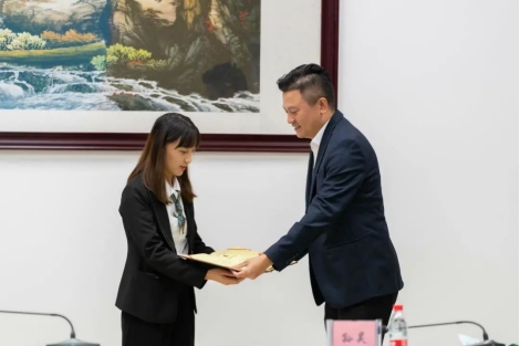 会上,蓝永金宣读了《关于聘任陈泽鹏等120名毕业生为2021届年级校友理事会理事的决定》,孙昊副会长为2021届年级校友理事会理事代表黄利丹颁发聘书。