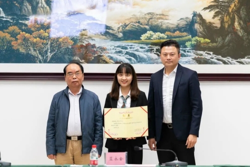 蓝永金副校长副书记(左),孙昊副会长(右)与黄利丹(中)代表合照