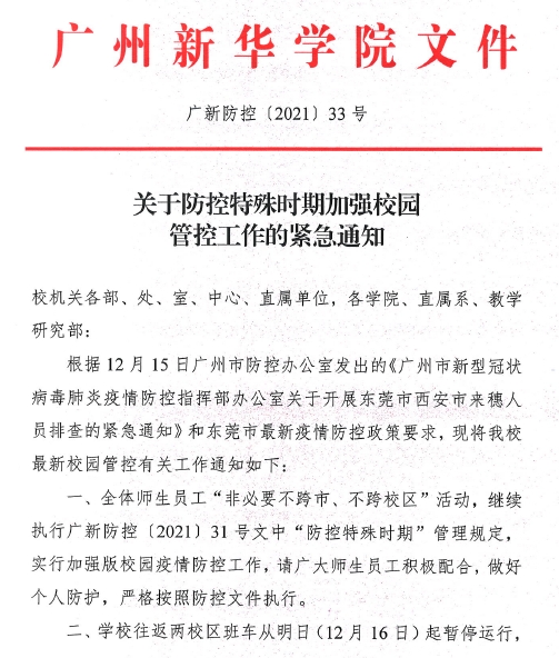 根据省、市政府部门疫情防控文件和全省学校传染病防控培训暨第77次专班视频调度会议精神,学校迅速启动加强版校园疫情防控方案,学校防控办在12月5日发布了疫情防控紧急通知之后,又先后印发了广新防控〔2021〕31号、广新防控〔2021〕32号和广新防控〔2021〕33号等文件,第一时间部署防控工作,严密各项防控举措,严格进出校门审批和管控,严禁校外无关人员进入校园;加强师生健康监测,建立工作台账;执行“谁主办,谁负责”制度,暂停举办聚集性活动;暂停校际班车,减少两校区教职工跨市流动;加强正面宣传与引导,及时发布疫情最新情况,做好舆论引导和舆情应对工作;强化物资保障,补齐配足防控物资;加强疫情值班值守,管好应急处置;全方位筑牢校园疫情防控网。