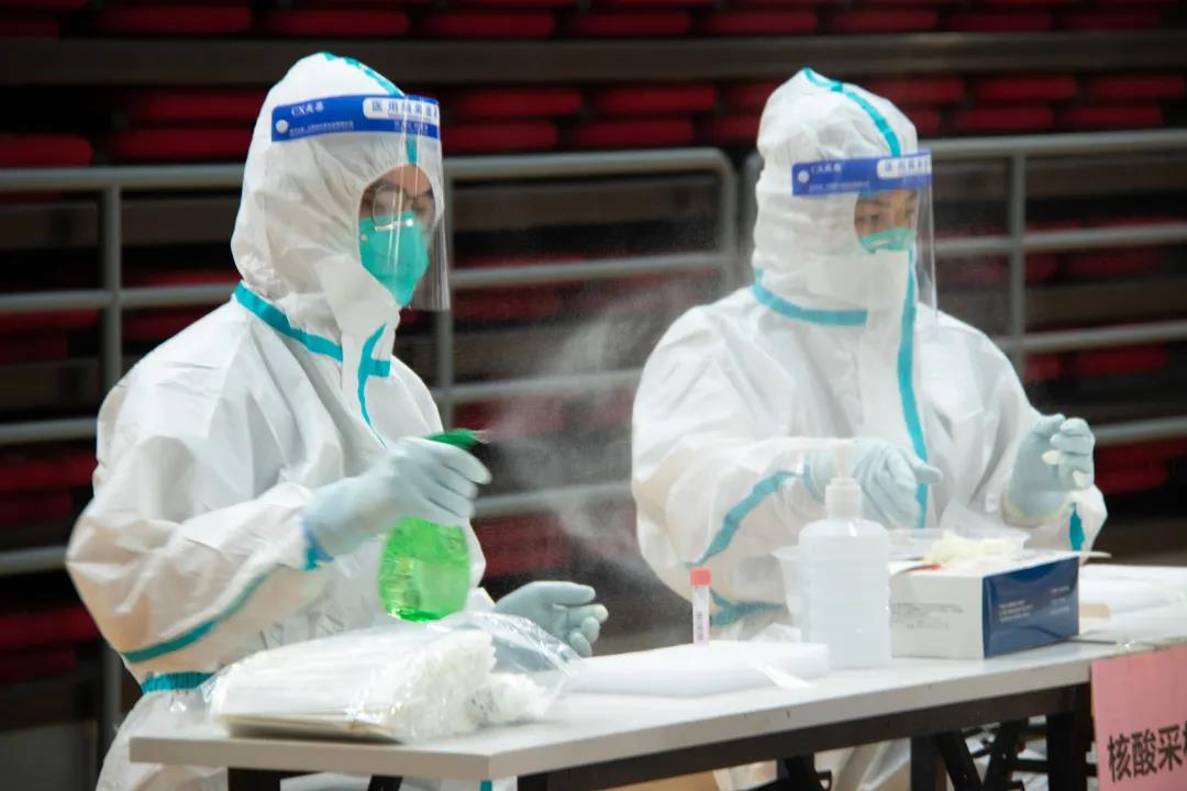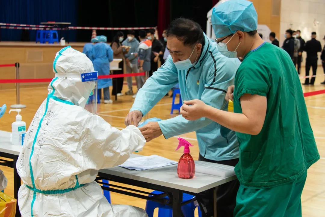 在核酸检测采样工作的现场,300余名身着蓝色防护服的志愿者引导师生分时段有序排队进入检测采样场地,为核酸检测工作的顺利进行提供保障。