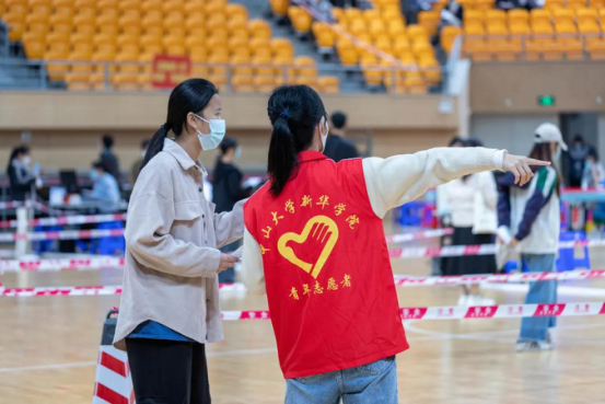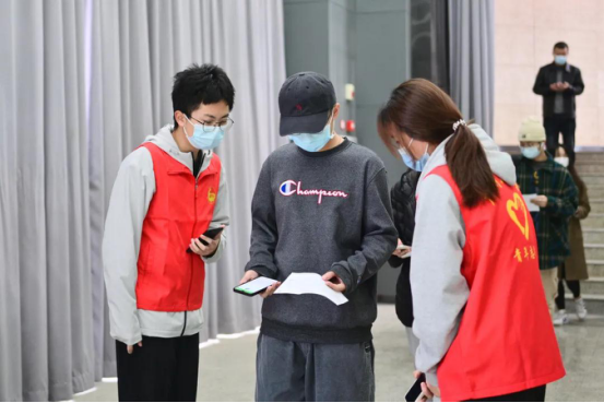 经过昨日的核酸检测活动后,21级法学专业的王亦琛(右一)对身穿防护服、辛勤工作的志愿者们心生向往,毫不犹豫地报名了此次志愿服务活动。其中,她主要负责的工作是在留观区引导接种师生隔位就坐。在工作过程中。她印象最深刻的是一位在留观过程中与她亲切交谈的老师。老师主动询问志愿者是否用过了早餐,并提出了代买早餐的想法,这令她深受感动。