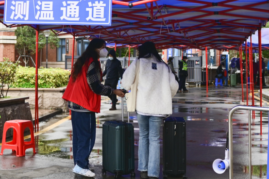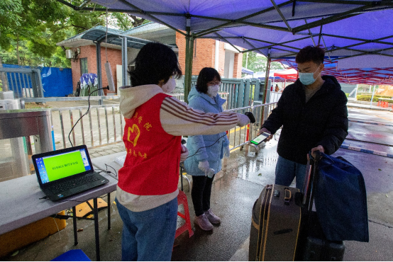 志愿者身穿的“红马甲”,依然是校园里最靓丽的风景。志愿者们协助教职员工进行测温、扫码等工作,帮助同学们搬运行李,体现了