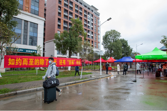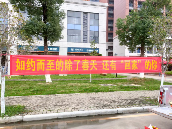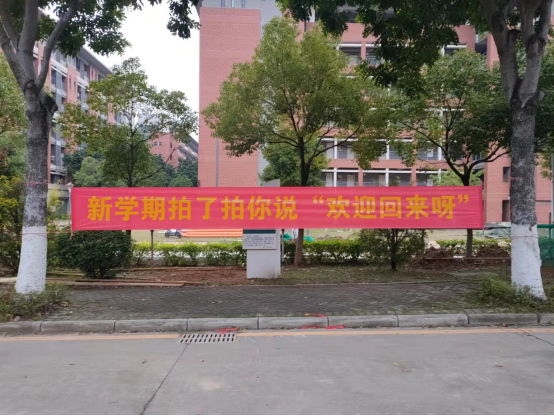 学校还在校门口、校道旁设置了暖心展板和横幅,欢迎同学们“回家”,叮嘱同学们做好防疫工作。