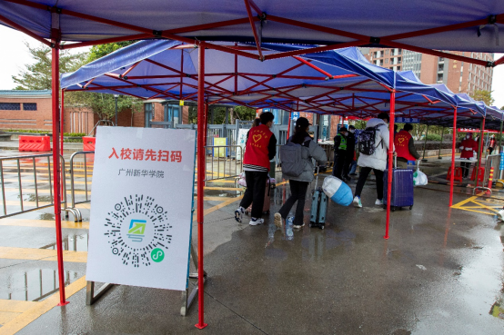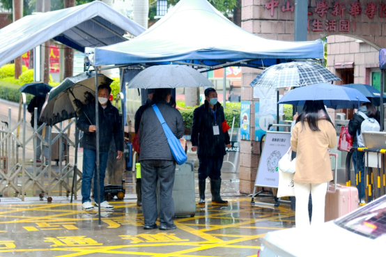 校门处,三十余个帐篷拼接搭建而成的“健康长廊”,是为同学们遮挡风雨的暖心“第一站”。同学们扫描iXH健康码、检查粤康码和行程卡、测温、核酸检测等流程,均有学校的贴心服务,为大家遮风避雨。