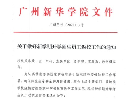 根据《关于做好新学期开学师生员工返校工作的通知》(广新防控〔2022〕3号),各部门、院系做好“五本台账”(处于中高风险地区师生台账、有中高风险地区所在地市旅居史师生台账、有省外陆地边境口岸城市旅居史师生台账、有重点关注地区旅居史师生台账、处于传染病急性期师生台账),按照要求及时落实学校人员,特别是有中高风险地区旅居史和到过重点关注地区的人员进行分类健康管理,严防疫情输入校园;经审批通过后,师生持48小时内核酸阴性报告,于2月19日、20日分批错峰返校;身处中高风险地区师生暂缓返校;学校将于2月21日正式开学。