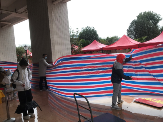 为尽可能减少寒风骤雨对医护人员和同学们的影响,总务处在核酸检测点拉起了一道“防风长城”,帮助医护人员和同学们抵御风雨严寒。