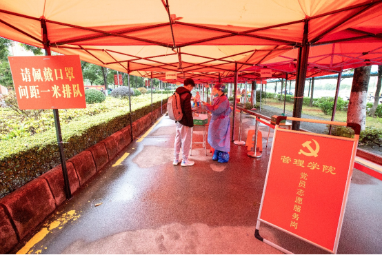 管理学院设置党员志愿服务岗,师生党员充分发挥先锋模范作用,积极行动、担当作为,投身到校园防控疫情第一线。