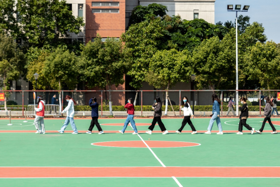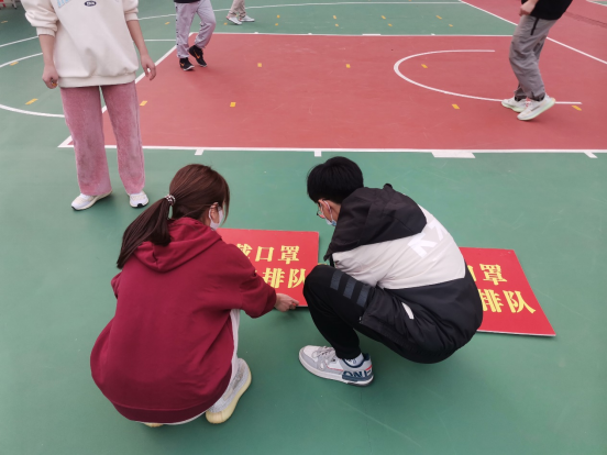 师生自觉佩戴口罩,分组排队、分批进入,场地标识黄色地标线,师生保持安全距离