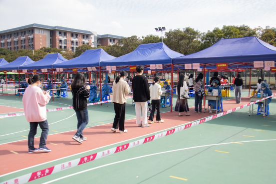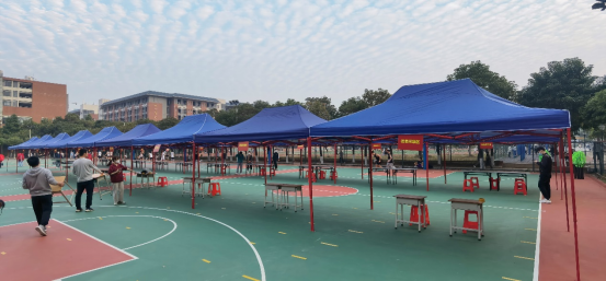 核酸采样现场设置单向进出口,标识“一米线”,并设“10+1”个摊位,为有虎门或常平旅居史的师生分设专用通道,确保检测流程安全有序。