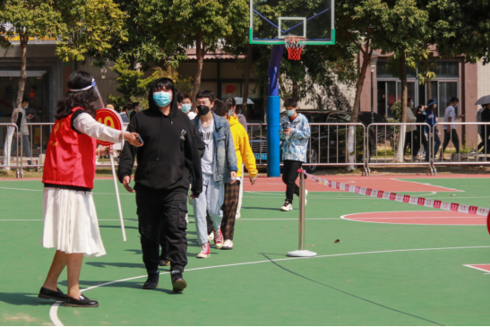“请提前打开粤康码,戴好口罩。”“等候期间,请保持一米安全距离。”身穿红马甲的志愿者引导师生有序扫码、进场、检测、离场,确保采样工作有序高效进行。