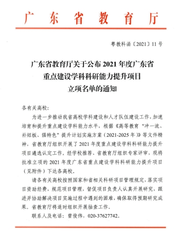 据了解,2021年12月,根据《广东省教育厅关于公布2021年度广东省重点建设学科科研能力提升项目立项名单的通知》(粤教科函〔2021〕11号),我校共4个项目取得立项。