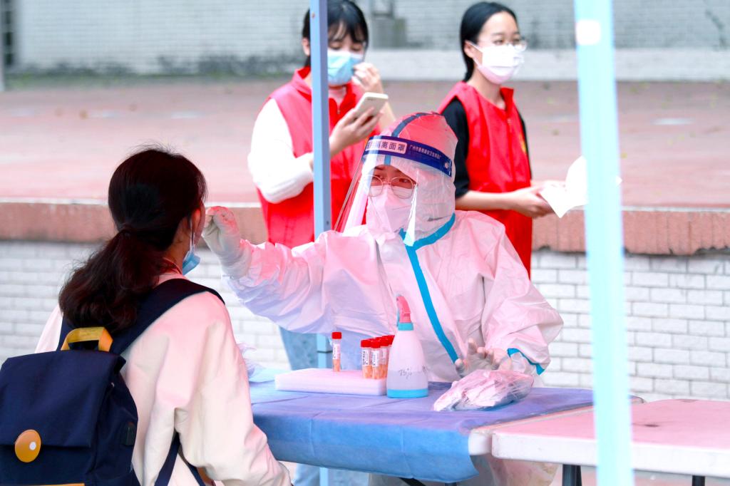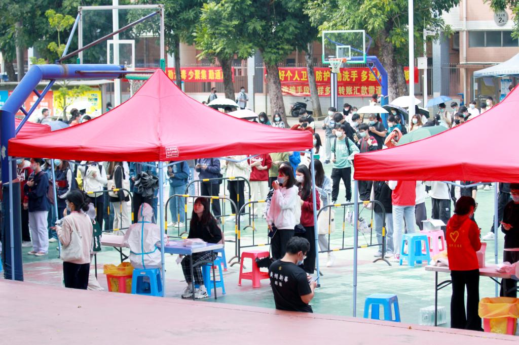 学校师生员工在采样区排队间隔一米,佩戴好口罩,不交谈