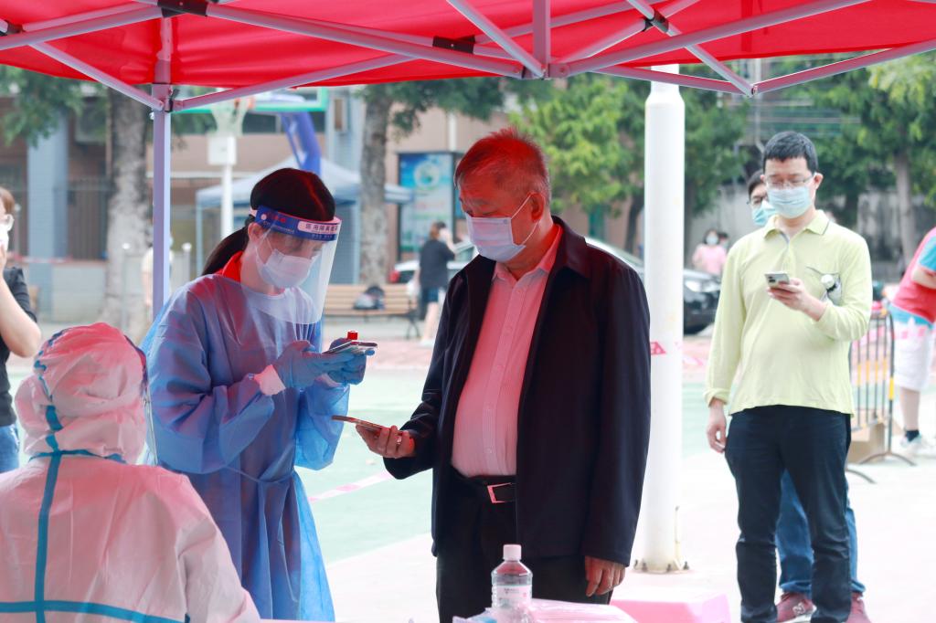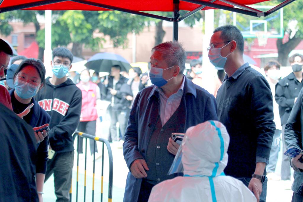 3月21日,王庭槐到广州校区核酸检测现场了解工作情况并参与检测