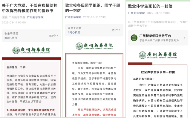 学生处于3月15日、17日,分别发布了《致全体学生家长的一封信》《关于进一步从严从紧做好疫情防控期间学生管理工作的通知》《致全体学生的一封信》,家校携手行动,共同筑牢抗疫家校共防“防护墙”,从严从紧做好疫情防控期间学生管理工作。