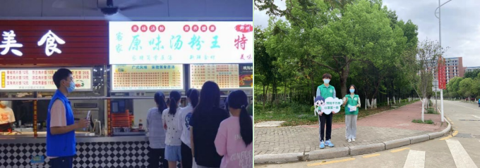 校团委发起号召,校内团学组织积极响应,青年志愿者们分别在早中晚三个时段开展“口罩常伴身,健康你我他”校园食堂站岗志愿活动和“‘艺’齐抗疫口罩常伴身 一米间隔不隔爱”活动,督促大家正确佩戴口罩,维持就餐秩序,指引就餐师生间隔一米有序排队打餐等。