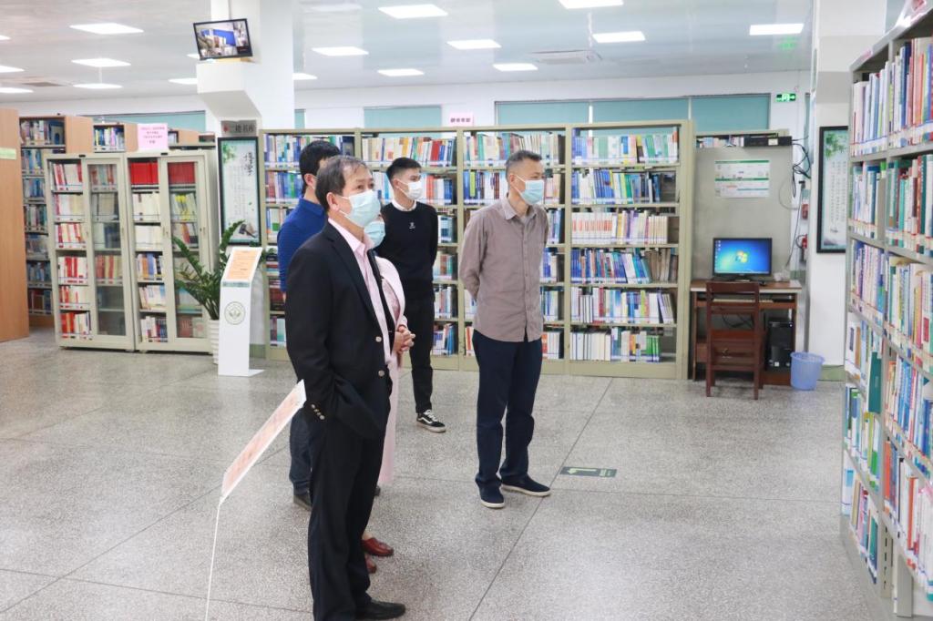 肖化副校长(右一)一行检查学校图书馆的消防安全整体情况