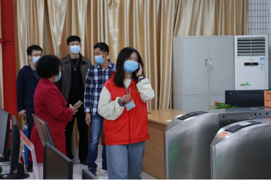 图书馆工作人员为发热学生进行测温并电话联络校医