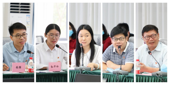 校长办公室(党委办公室)党支部、资源与城乡规划学院学生党支部、管理学院学生党支部、经济与贸易学院学生第一党支部、公共治理学院党总支进行汇报
