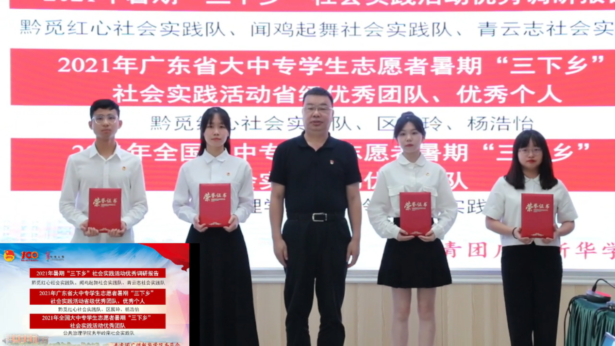 分管校领导(中)为“2021年暑期‘三下乡’社会实践活动优秀调研报告”“2021年广东省大中专学生志愿者暑期‘三下乡’社会实践活动省级优秀团队、优秀个人”“2021年全国大中专学生志愿者暑期‘三下乡’社会实践活动优秀团队”获奖代表颁奖
