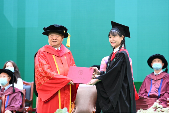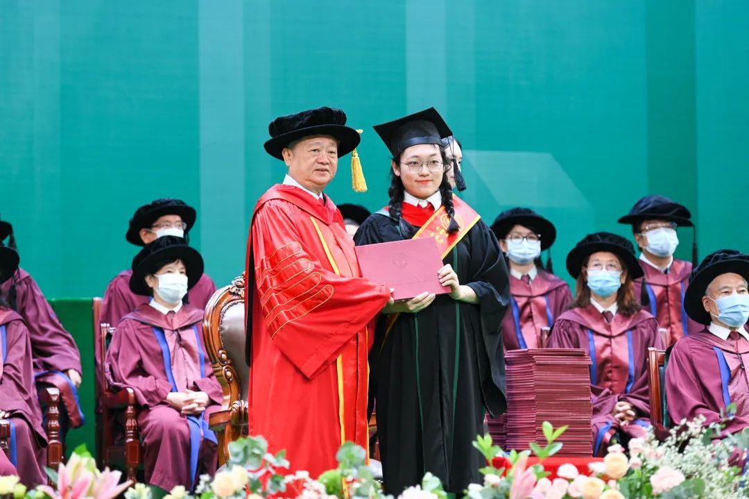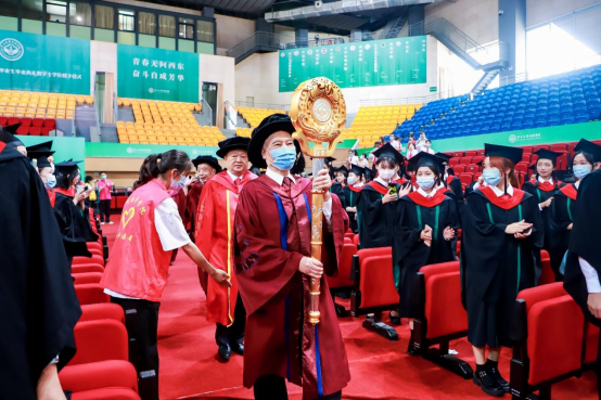 在主礼教授、学校领导、教学督导、优秀青年教师代表,各教学单位、职能部门负责人,各院系首席教授、学科带头人、教师代表的共同见证下,我校学位评定委员会主席、校长王庭槐教授为2022届6500余名学士学位获得者颁授学位。