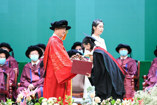 在学术权杖的见证下,我们迈着沉稳而坚定的步伐缓缓走向主席台,以鞠躬之礼向母校的谆谆教导表达最崇高的敬意。王庭槐校长把殷切的嘱托与真挚的祝愿化作手中的证书,亲自传递至我们每一位同学手中。