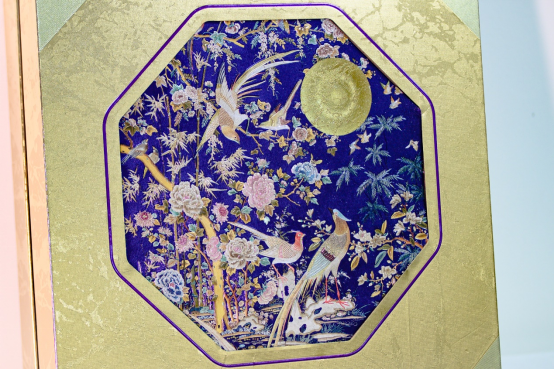 盒身图案华美典雅,湖面上水汽氤氲,圆月悬挂于高空,鸟儿伫立于花草间相望游嬉,各类繁花竞相开放,传统绣品文物元素与现代创新设计理念相融,营造出“花好月圆、鸟语花香”的祥瑞之气。精美而典雅的纹理既体现了广绣文化,又承载了月圆团聚、吉祥平安的美好祝福。