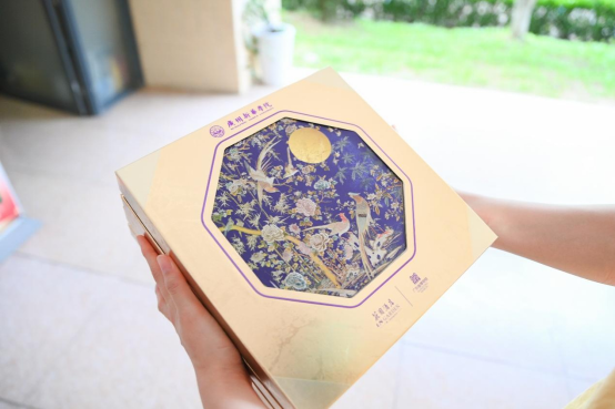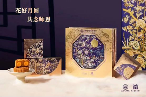 此次教师节暨中秋佳节慰问月饼礼盒设计别具一格。盒身图案设计以广东省博物馆馆藏文物《石青缎地‘宝生昌’号广绣花鸟大挂帐》的样式图案为原型,温婉晴朗,别具一格。