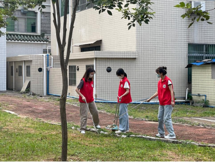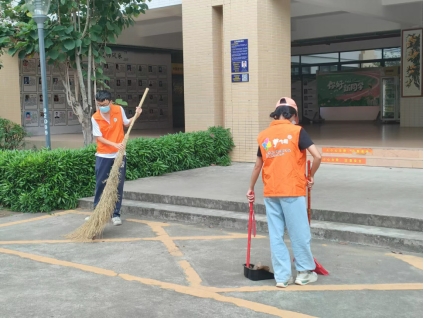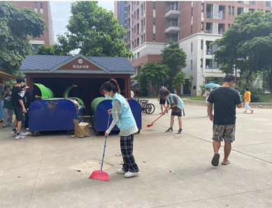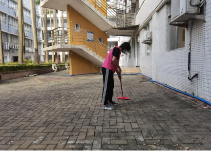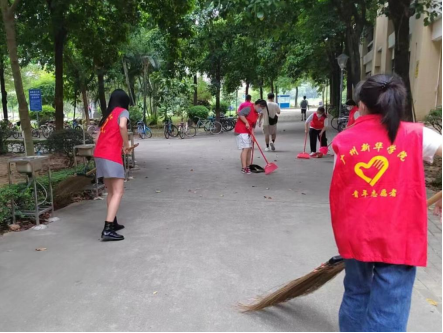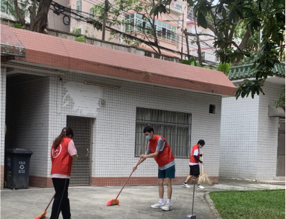 中国语言文学系榕树志愿服务队志愿者在清扫生活区地面
