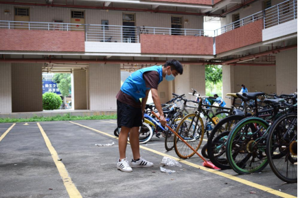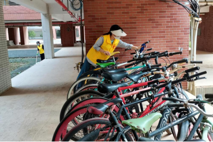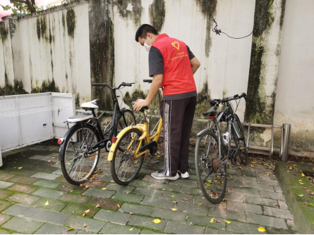 外国语学院向日葵志愿服务队志愿者摆放擦拭自行车