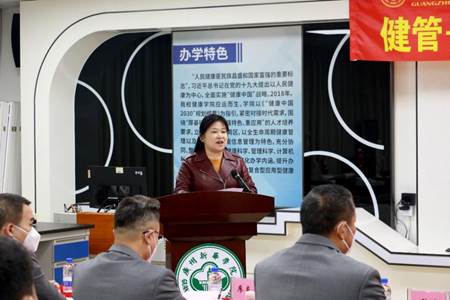 梅碧琪代表健管-星创视光产业学院院长卓业鸿教授发言。她表示,通过校企合作对眼健康相应领域模式摸索,探索出一条可行性的新路子,并衷心祝愿健管-星创视光产业学院在