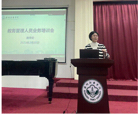 (以下简称“我校”)转设过渡期的检查评估,2月21日,我校在东莞校区召开教务管理人员业务培训会。我校副校长肖化、教务处处长苏宁、副处长徐娟娟、教务处员工、各教学单位办公室人员、教学秘书等80余人参与本次会议。会议由教务处副处长陈宝琪主持。