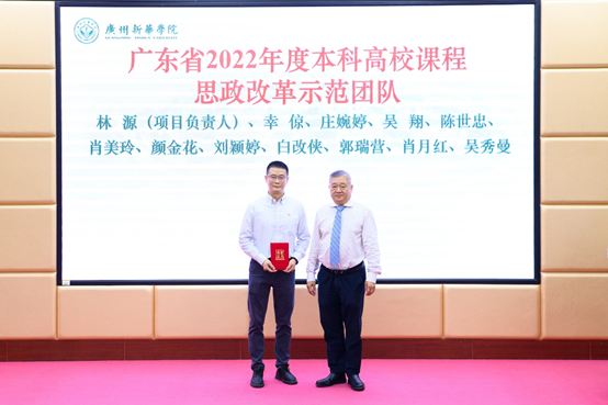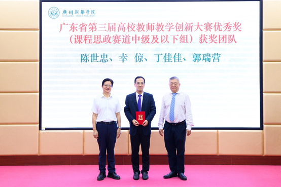 王庭槐校长、郝登峰书记为“广东省第三届高校教师教学创新大赛优秀奖(课程思政赛道中级及以下组)获奖团队”颁奖