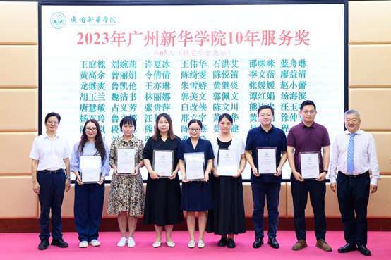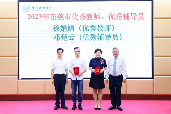 王庭槐校长、郝登峰书记为“2023年东莞市优秀教师、优秀辅导员”获奖者代表颁奖