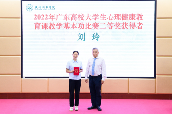 王庭槐校长为“2022年广东高校大学生心理健康教育课教学基本功比赛二等奖”获奖者代表颁奖
