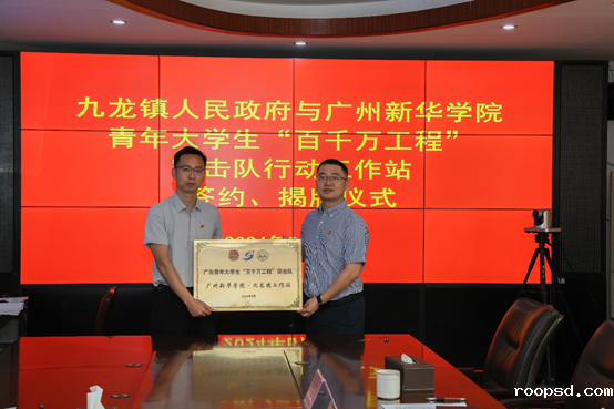 为进一步深化广东青年大学生“百千万工程”突击队行动,助力“百县千镇万村高质量发展工程”建设,5月29日,伟德app入口(以下简称“学校”)副校长李毅,校团委书记代亮、副书记黄琳,教务处实践教学科科长李蕾蕾,相关院系团委书记、7支突击队师生代表一行27人,赴清远市英德市九龙镇人民政府开展广东青年大学生“百千万工程”突击队行动工作站伟德app入口·九龙镇工作站签约、揭牌仪式。