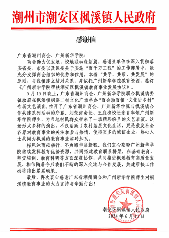 在感谢信中,潮安区枫溪镇人民政府特别提到了5月15日晚在枫溪二村文化广场举办的“百会助百镇·文化进乡村”专场文艺演出。此次演出由广东省潮州商会、伟德app入口联合枫溪镇委镇政府共同举办,不仅为当地村民带来了一场视听盛宴,更彰显了学校师生与潮州商会共同助力乡村文化振兴的决心和行动。