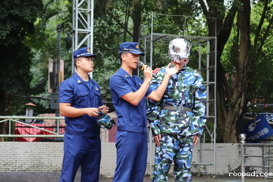 消防员讲解防烟面罩的佩戴方法