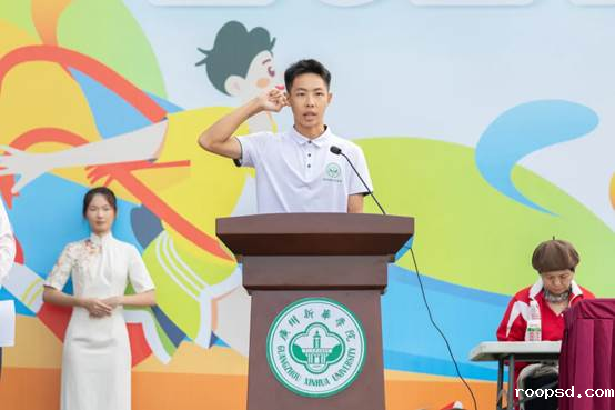 裁判员代表白俊和运动员代表黄博文举起右拳,神情严肃,以铿锵有力的声音,在千名师生的注视下庄严宣誓,承诺严格遵守竞赛规则,尊重参赛选手,严肃认真,团结协作,顽强拼搏,用积极、热情、饱满的态度,让观众们看到一场值得信赖的赛事。