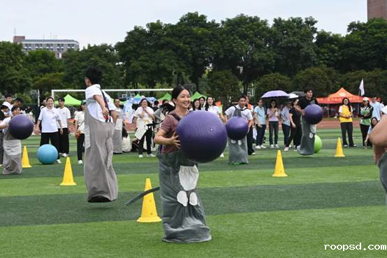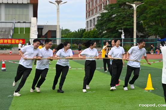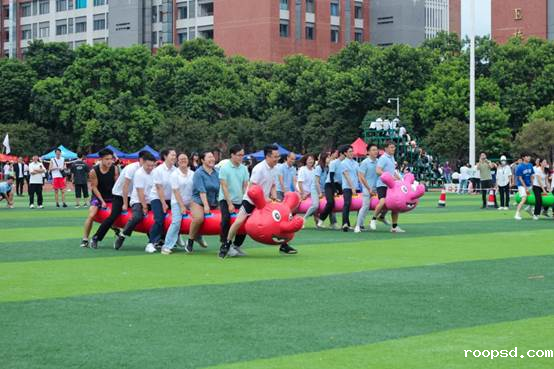 教职工比赛现场,平日里严肃认真的老师们化身为活力四射的运动员,积极参与袋鼠接龙、两人三跑、旋风跑等趣味竞赛,欢声笑语不断。毛毛虫竞速和指压板冲关更是考验着老师们的默契与勇气,他们不甘落后,奋力拼搏,展现出别样的青春风采。拔河与跳绳比赛中,老师们咬紧牙关,凝心聚力,周围学生的呐喊助威声此起彼伏,双方斗志昂扬,共同诠释了团结协作、勇攀高峰的精神。
