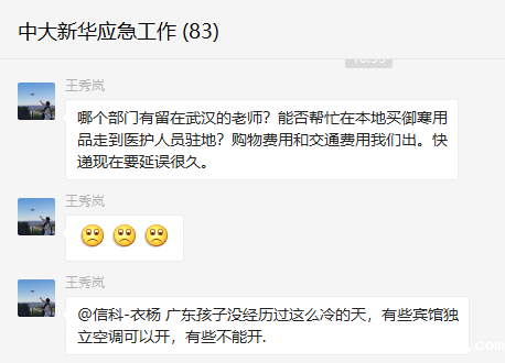 2月16日早上,在又一次下单失败之后。她在中大bv伟德体育app官网应急工作微信群(学校在疫情发生后即刻成立的由学校领导、各二级单位负责人组成的线上工作群)中发布了这样一条求助消息“哪个部门有留在武汉的老师?能否帮忙在本地买御寒用品送到医护人员驻地?购物费用和交通费用我们出。快递现在要延误很久。”